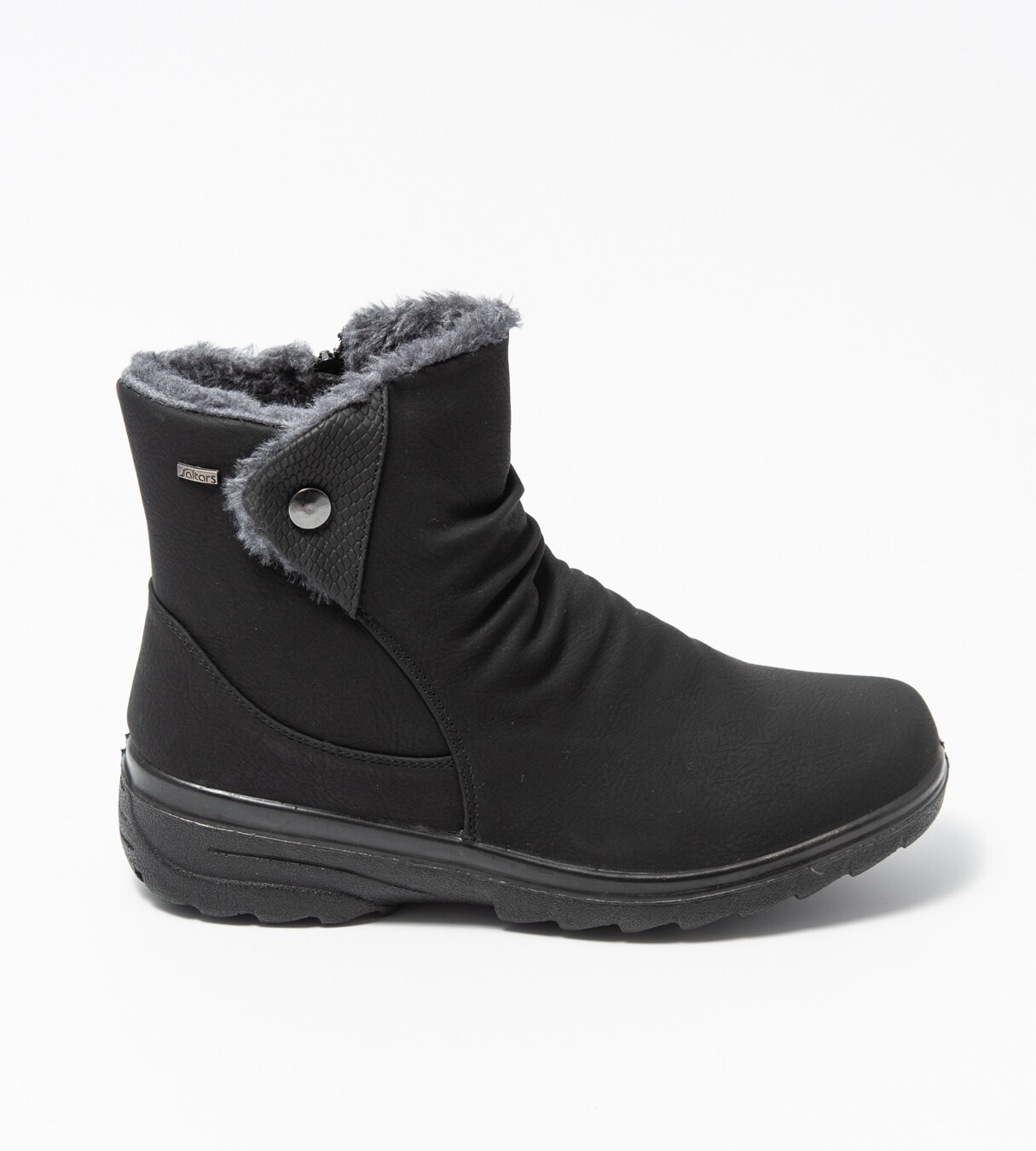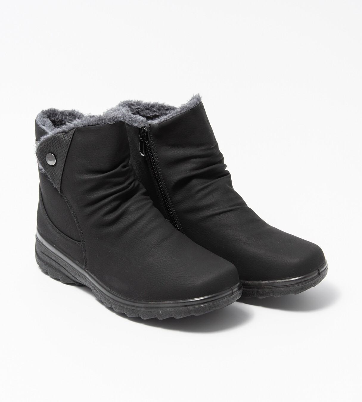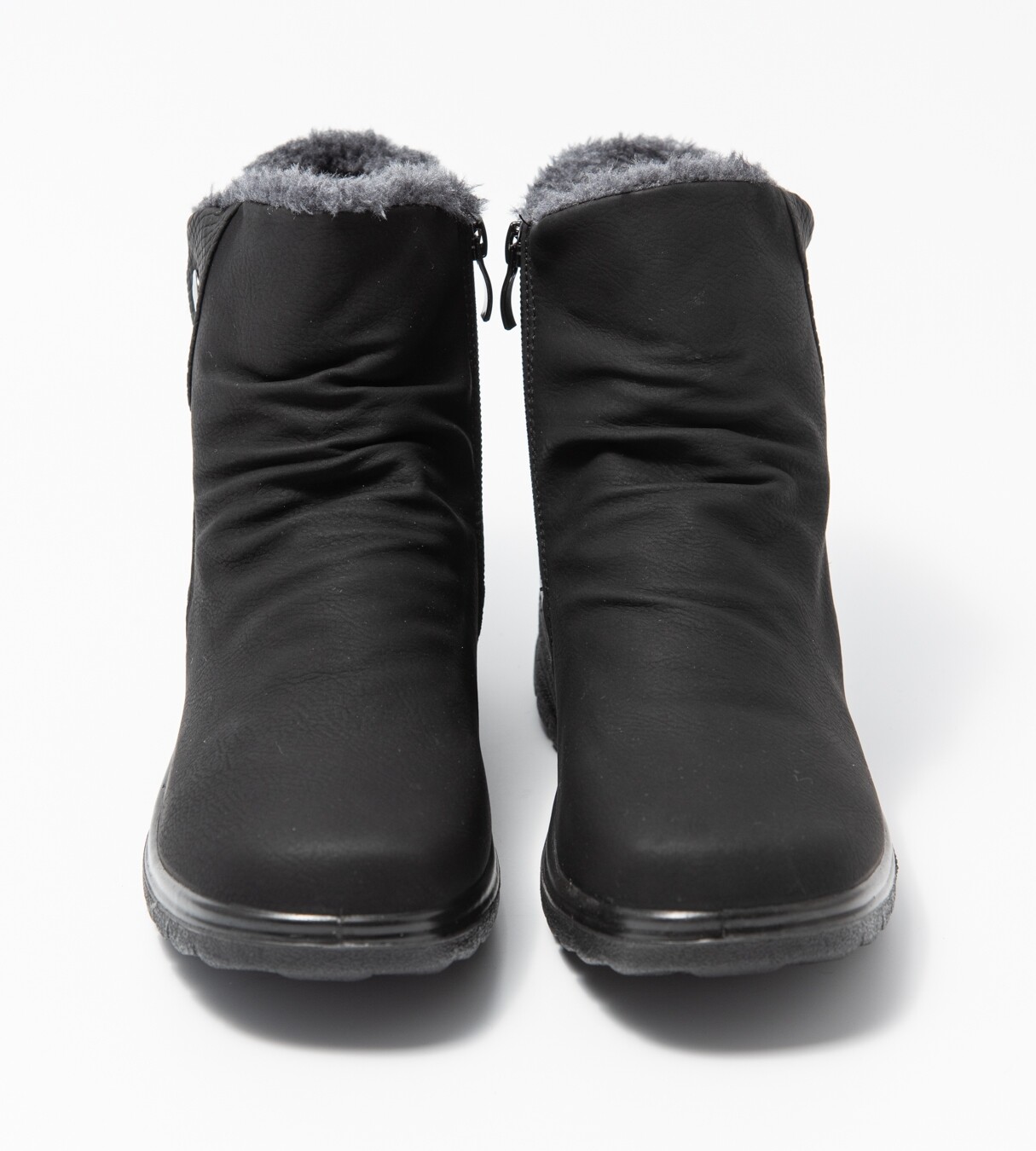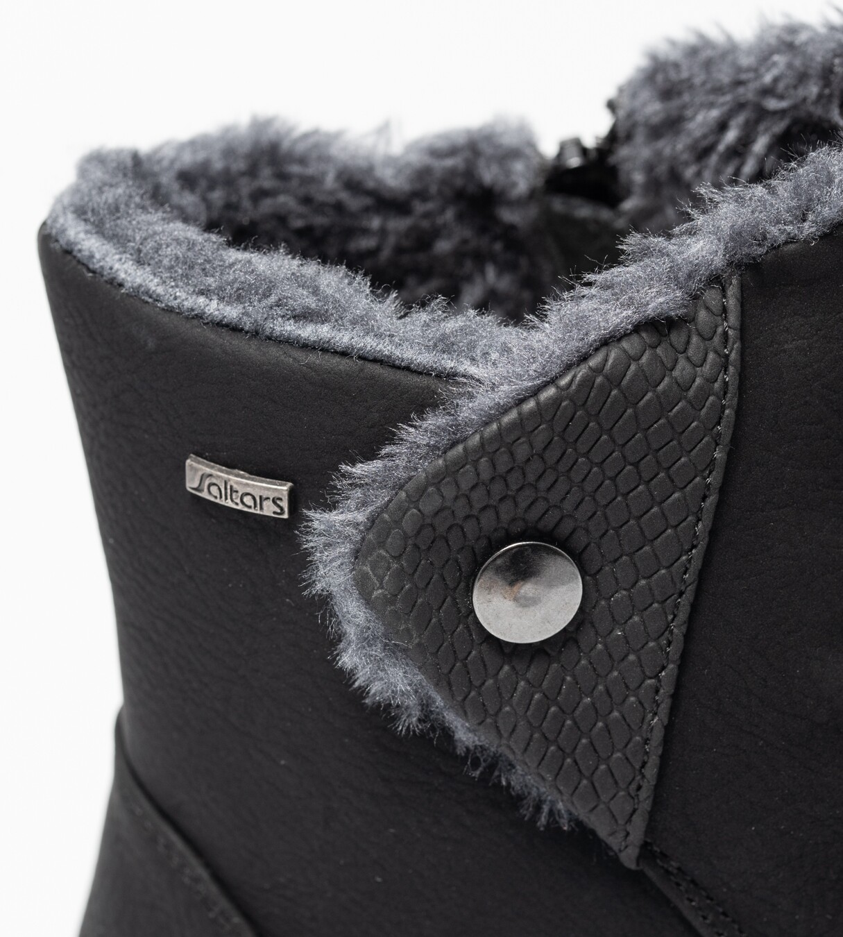 Bota de cano baixo com forro de pelo grosso. Apresenta um fecho na lateral interior e um botão na lateral exterior.