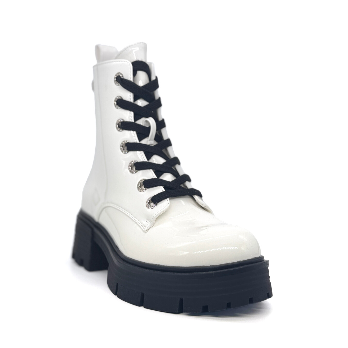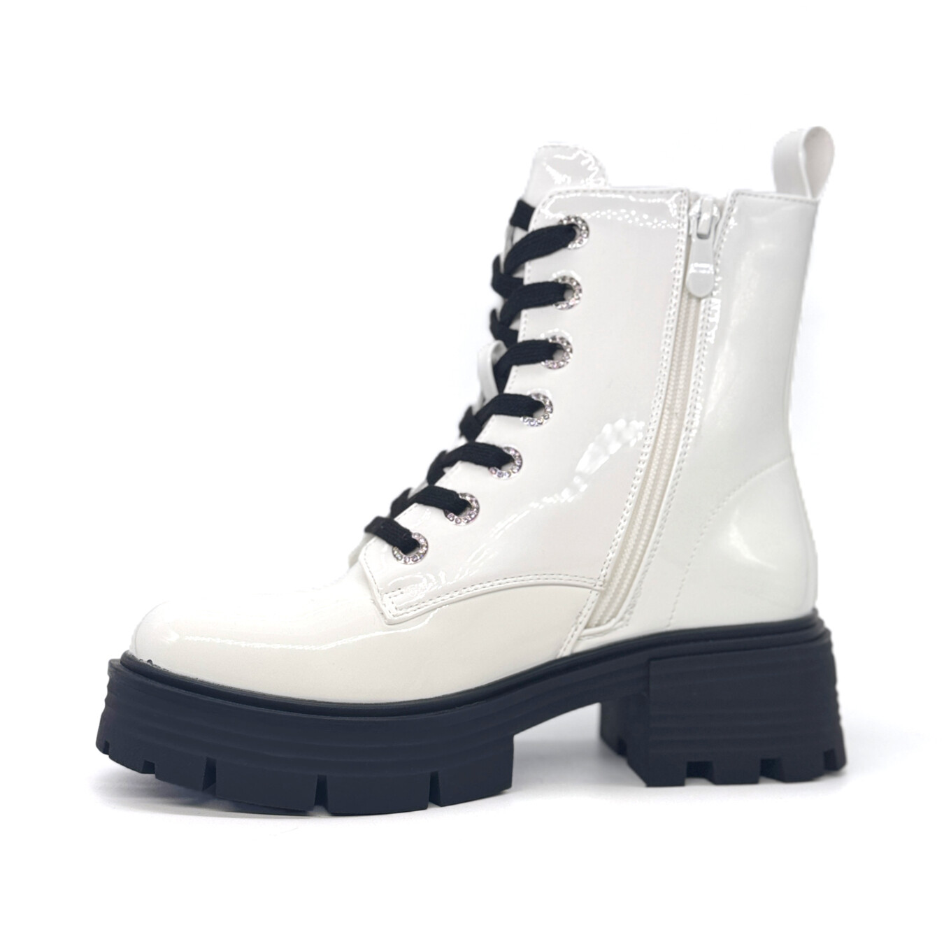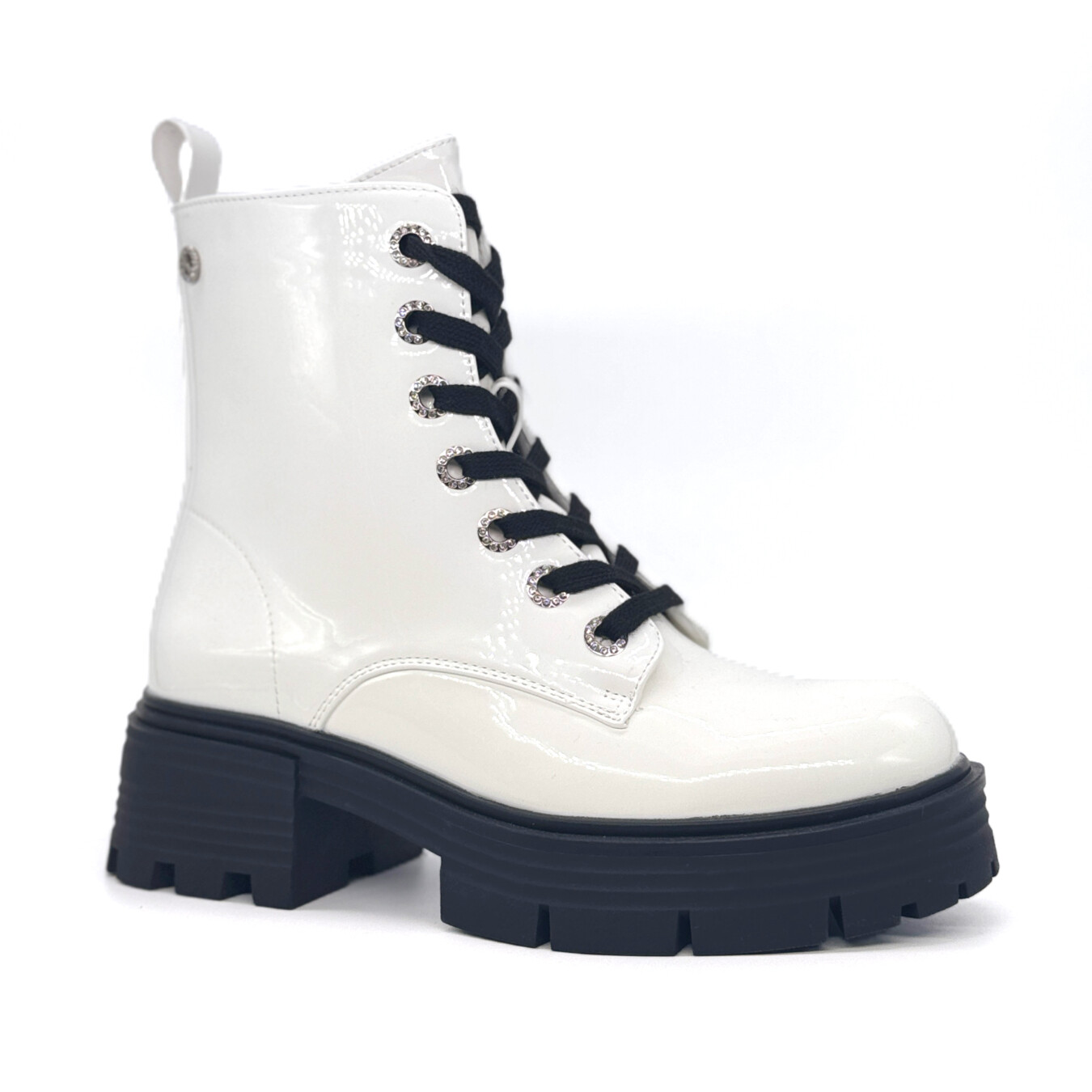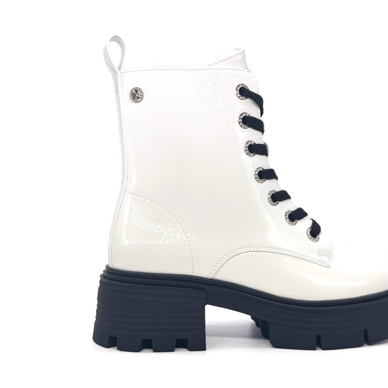 中筒靴,表面带有光泽效果。鞋子正面配有系带设计和金属鞋眼。鞋底厚实耐用,带有防滑纹路。后部配有提环,方便穿脱。
