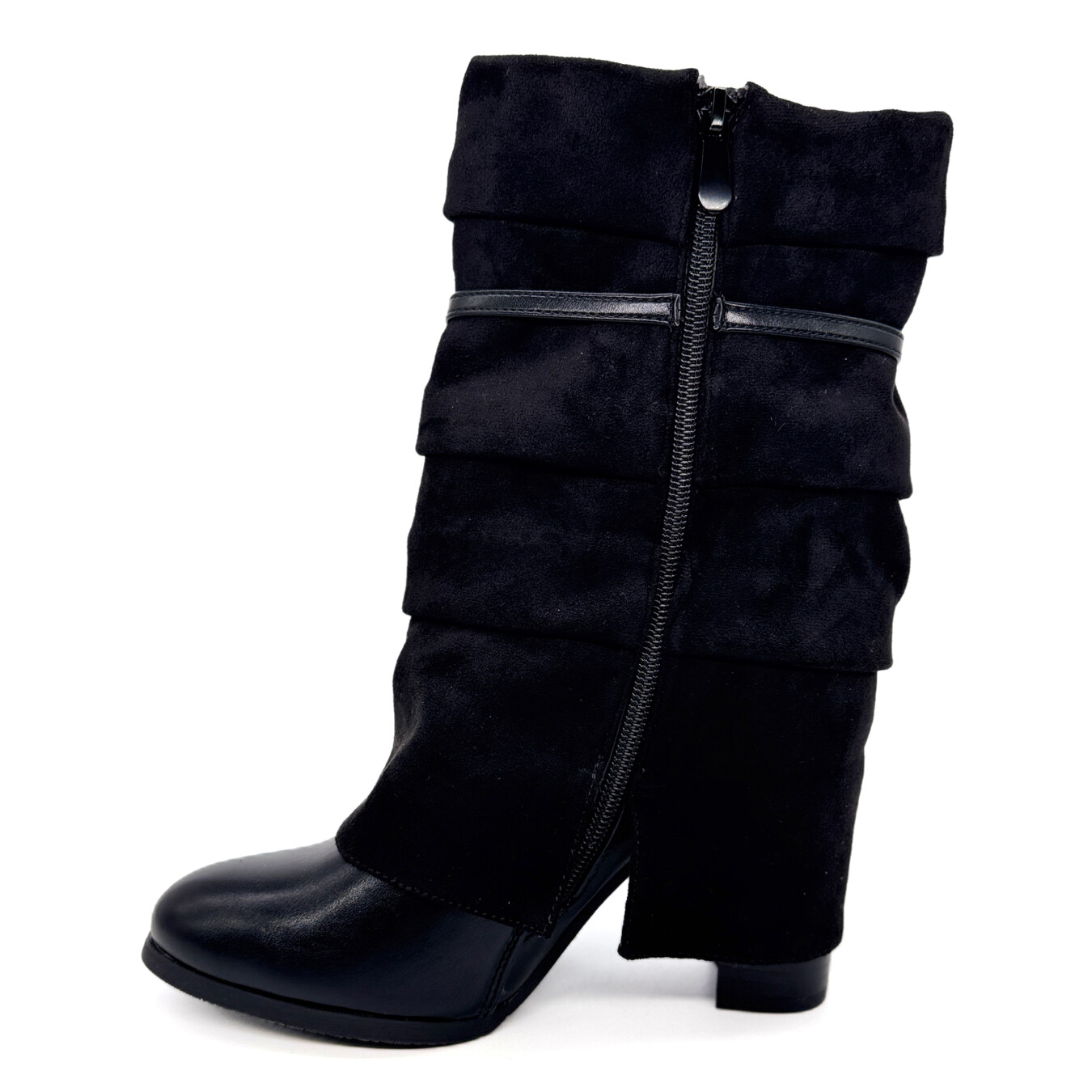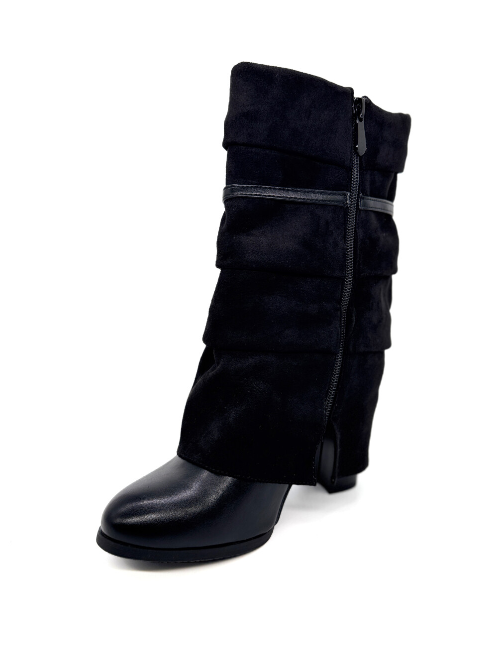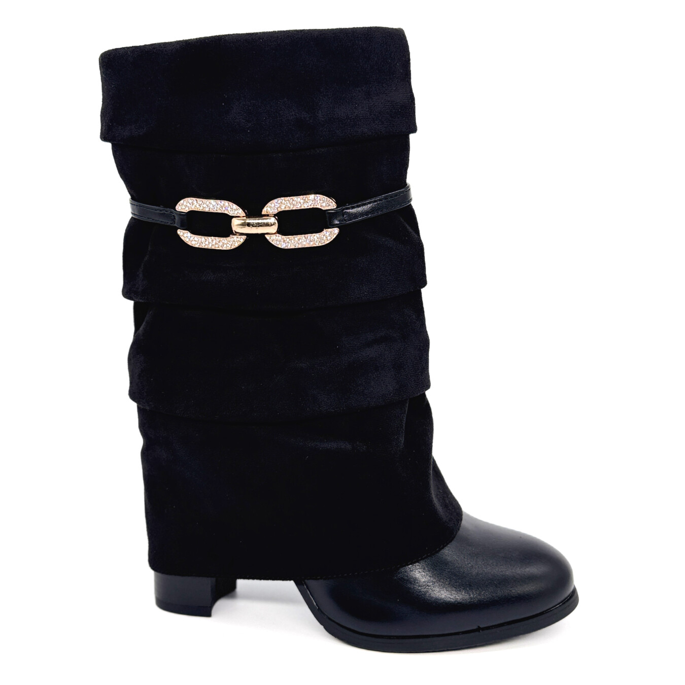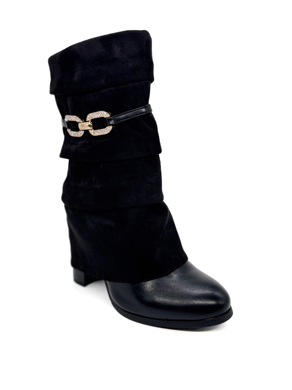 Bota de cano médio em camurça sintética, com acabamento macio e efeito enrugado que transmite elegância descontraída. Possui detalhe de tira fina com aplicação metálica dourada em formato de elos, decorados com brilho sutil, que adiciona sofisticação ao design. A parte inferior em material liso contrasta harmoniosamente com o cano em camurça, realçando o estilo moderno do modelo. O salto médio e largo oferece estabilidade e conforto, ideal para uso prolongado. Uma opção versátil que combina feminilidade e praticidade, perfeita para compor looks casuais ou mais refinados.