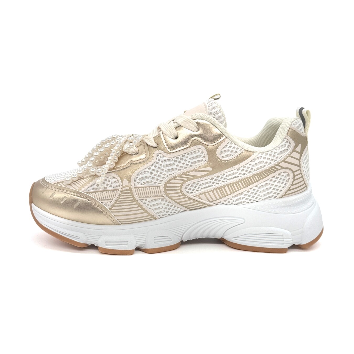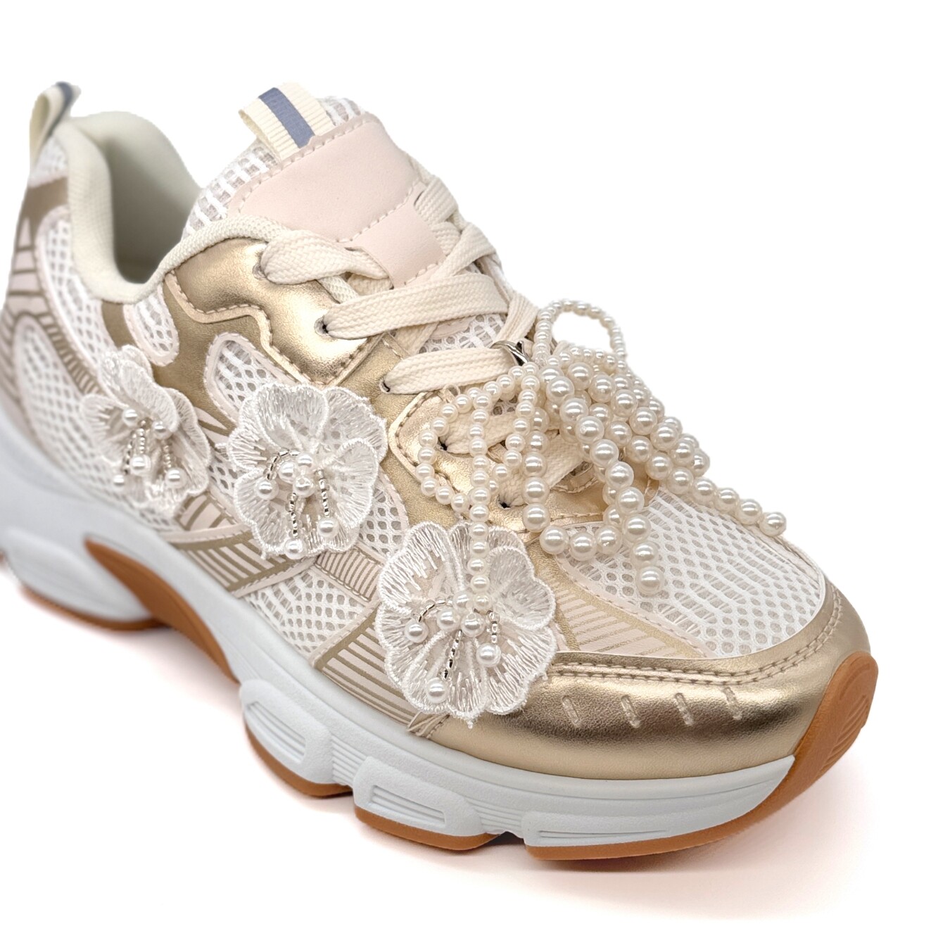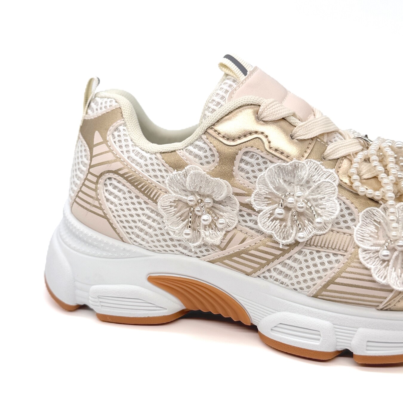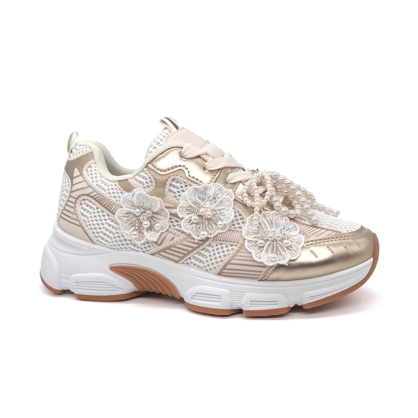 Sapatilha de cordão com três flores aplicadas na lateral externa. Contém um laço de pérolas artificiais retiráveis aplicado nos cordões.
