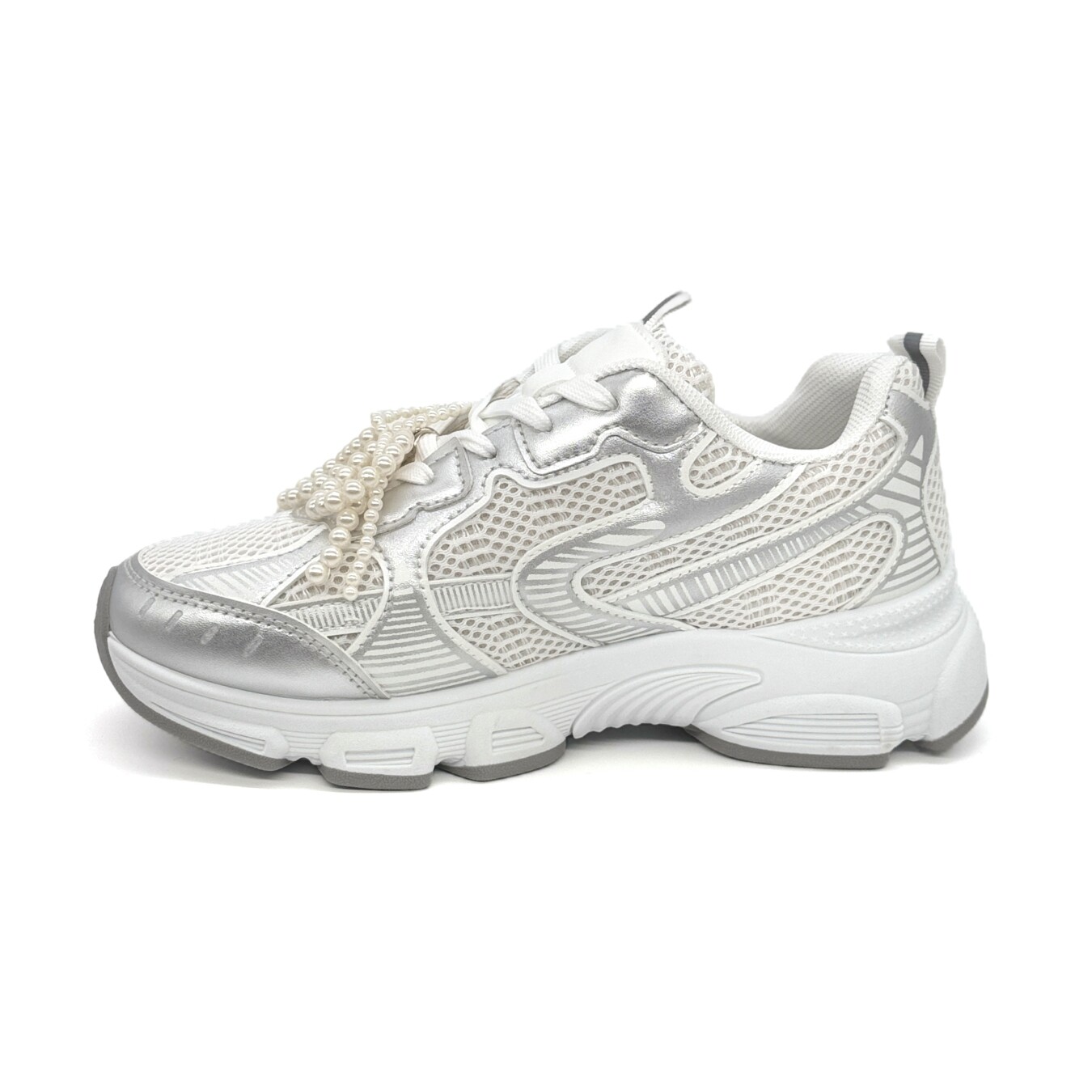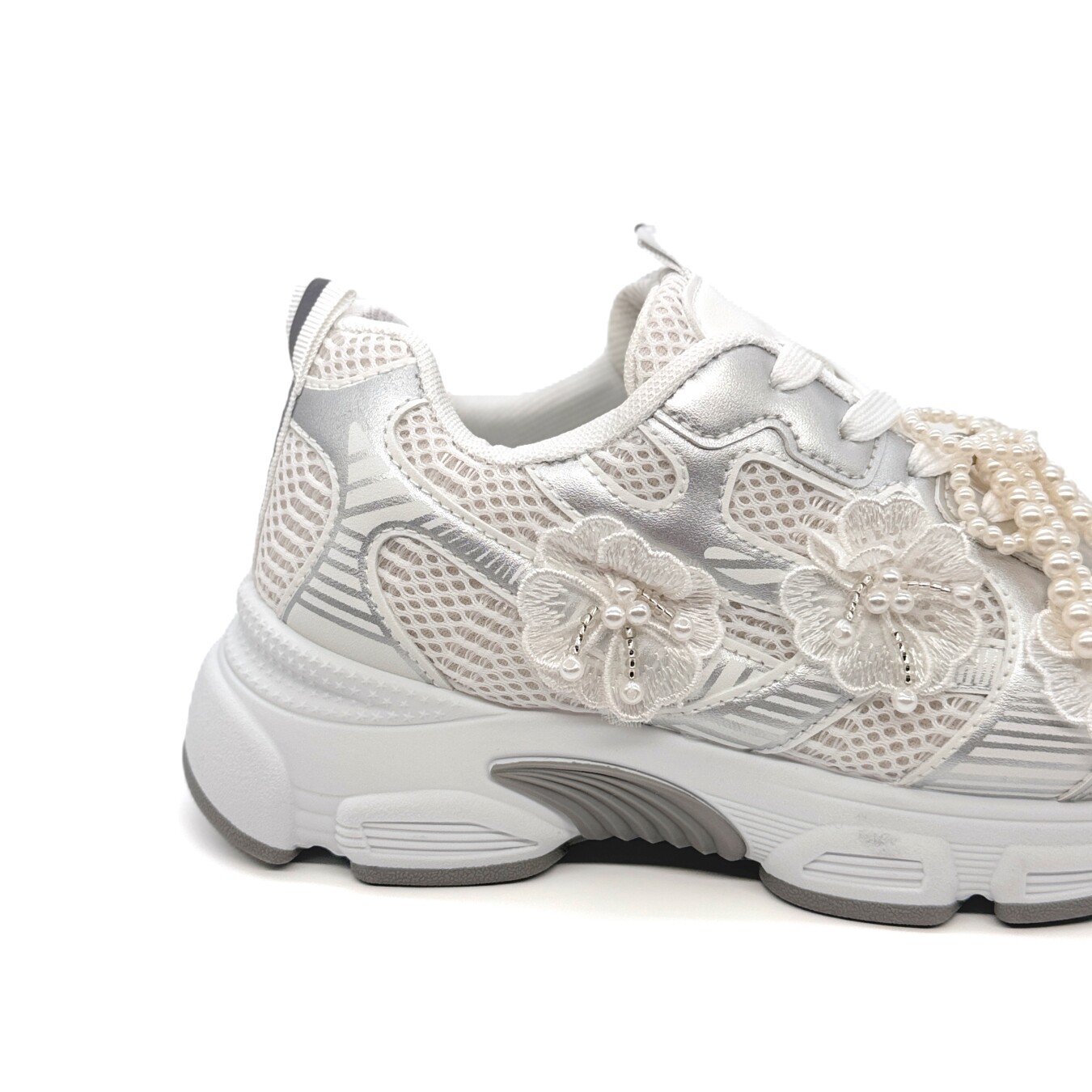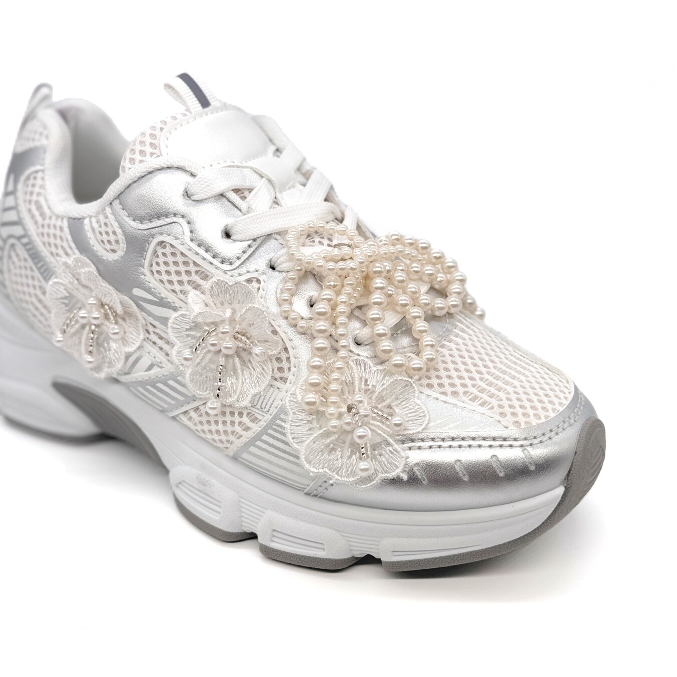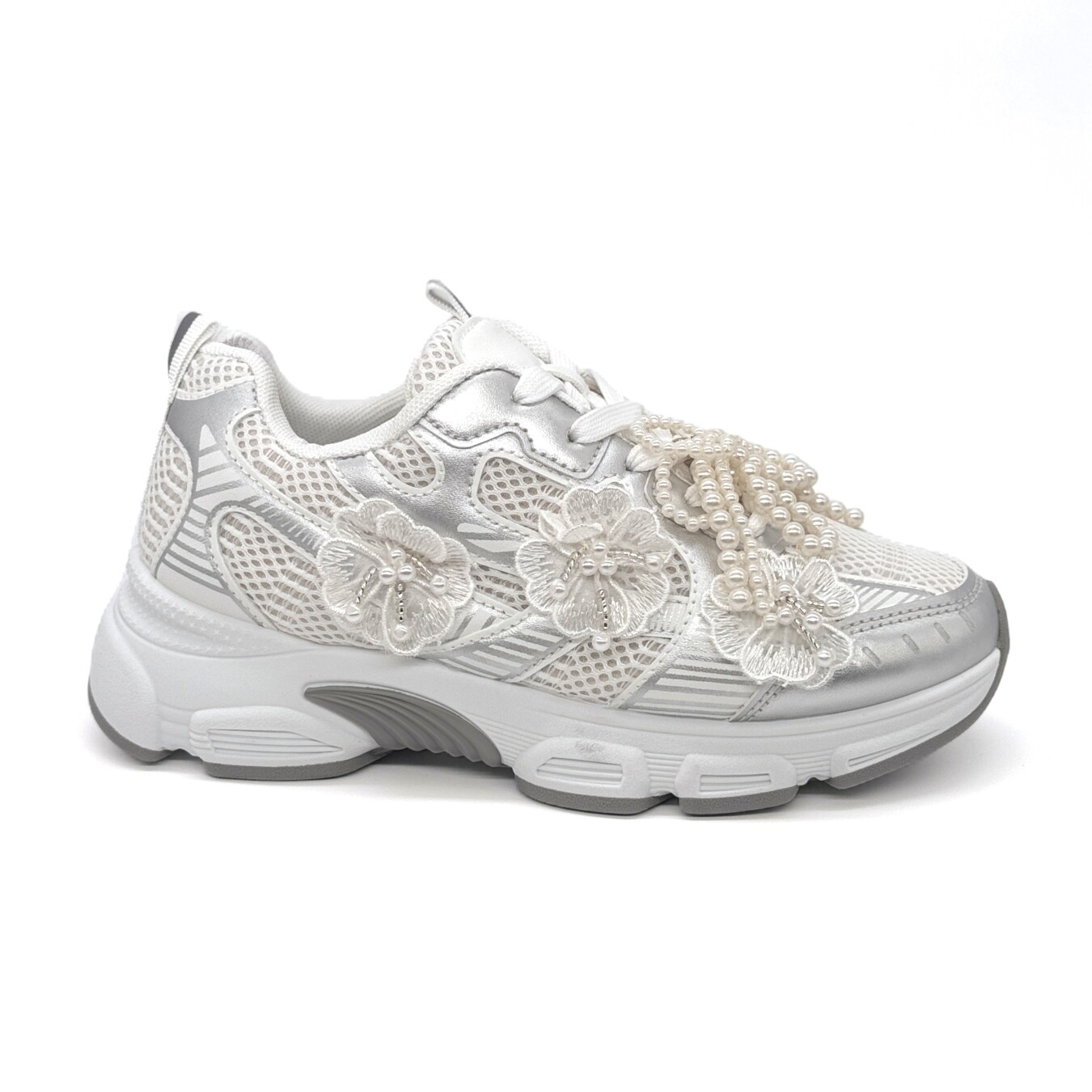 Sapatilha de cordão com três flores aplicadas na lateral externa. Contém um laço de pérolas artificiais retiráveis aplicado nos cordões.