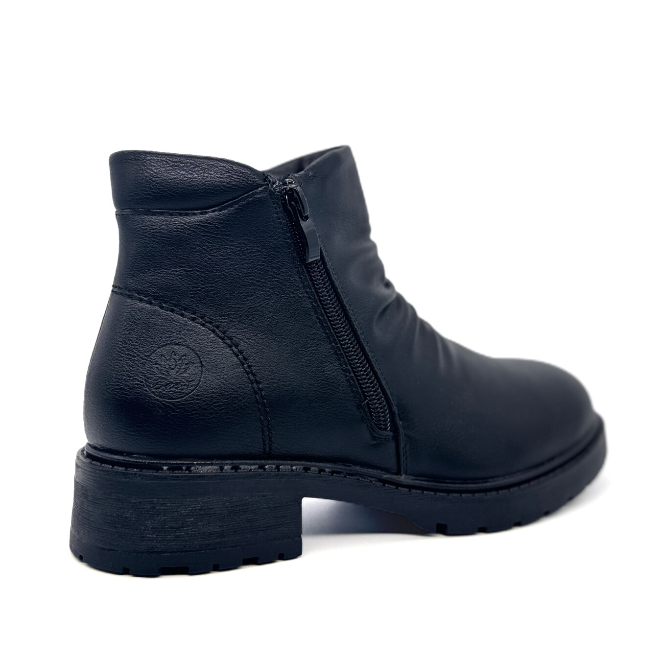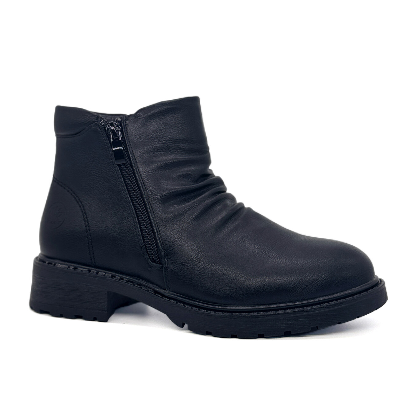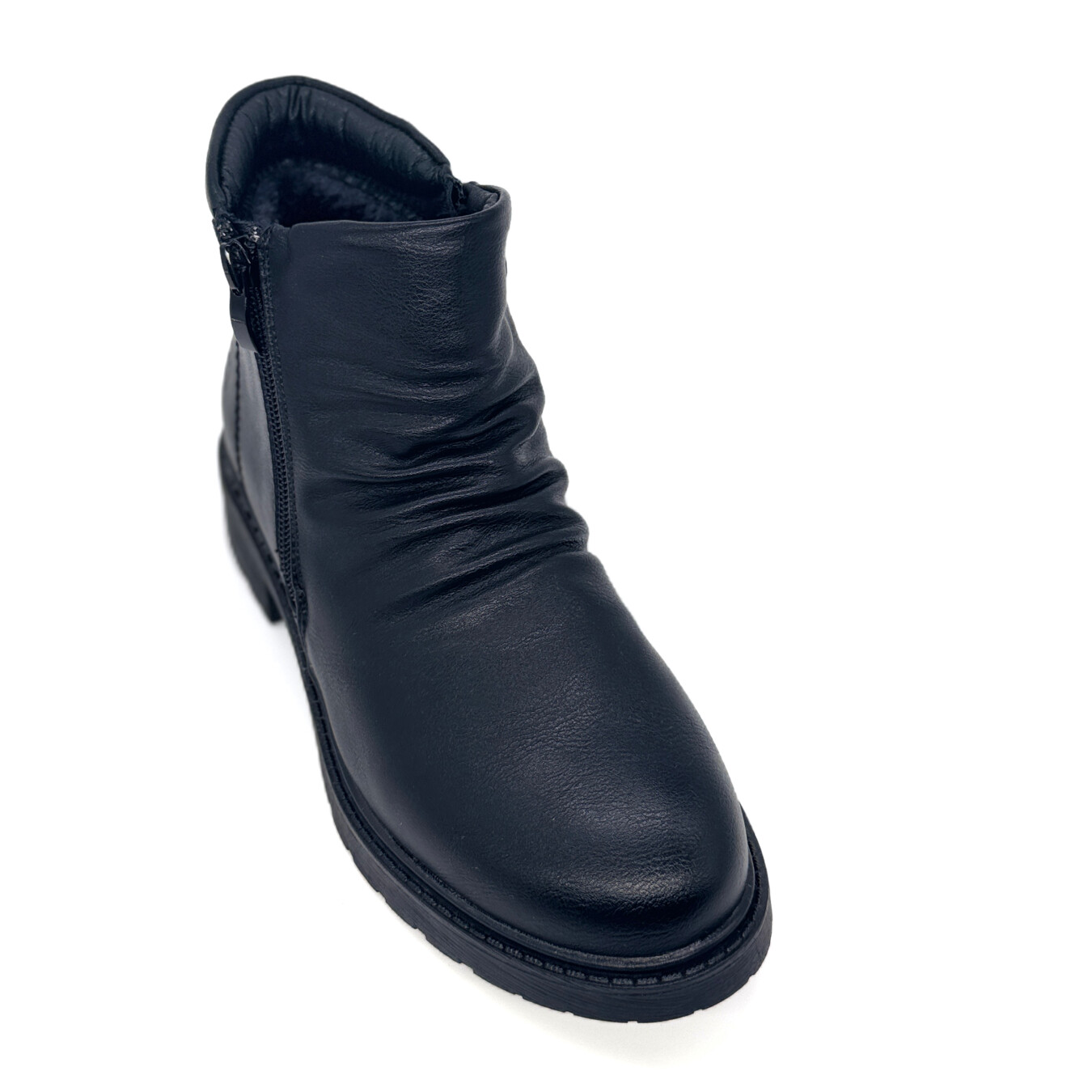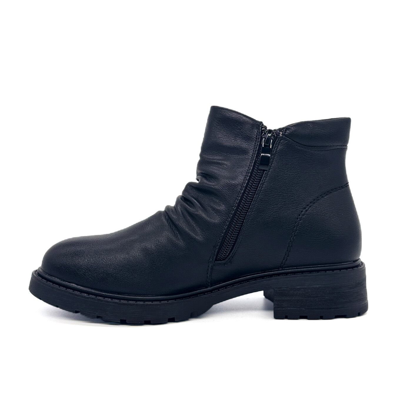 Bota de cano curto em material sintético com acabamento macio e maleável. O design simples e prático apresenta leve efeito franzido na parte frontal, conferindo um toque de estilo ao modelo. Conta com fecho lateral em zíper, que garante facilidade ao calçar e descalçar. A biqueira arredondada proporciona conforto extra no uso diário, enquanto a sola robusta com ranhuras profundas oferece maior aderência e estabilidade. Com salto baixo e resistente, esta bota é ideal para quem procura praticidade, conforto e versatilidade, adaptando-se facilmente a diferentes looks casuais.