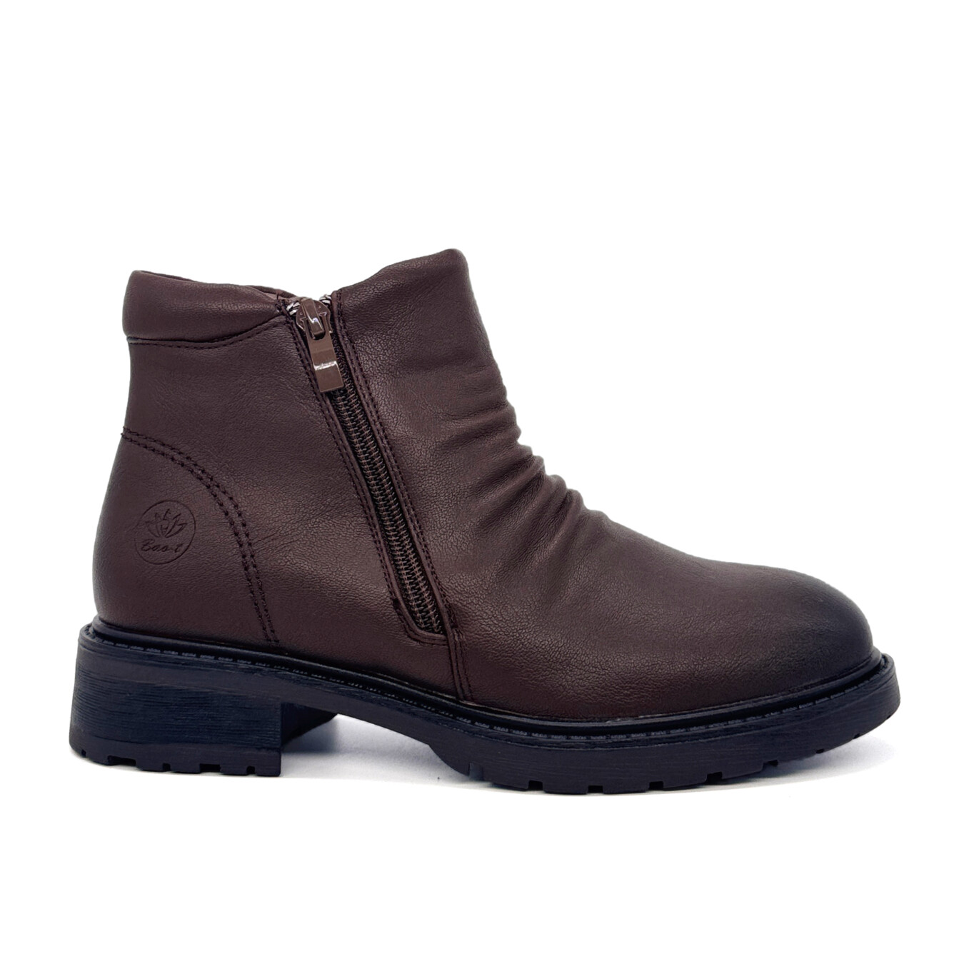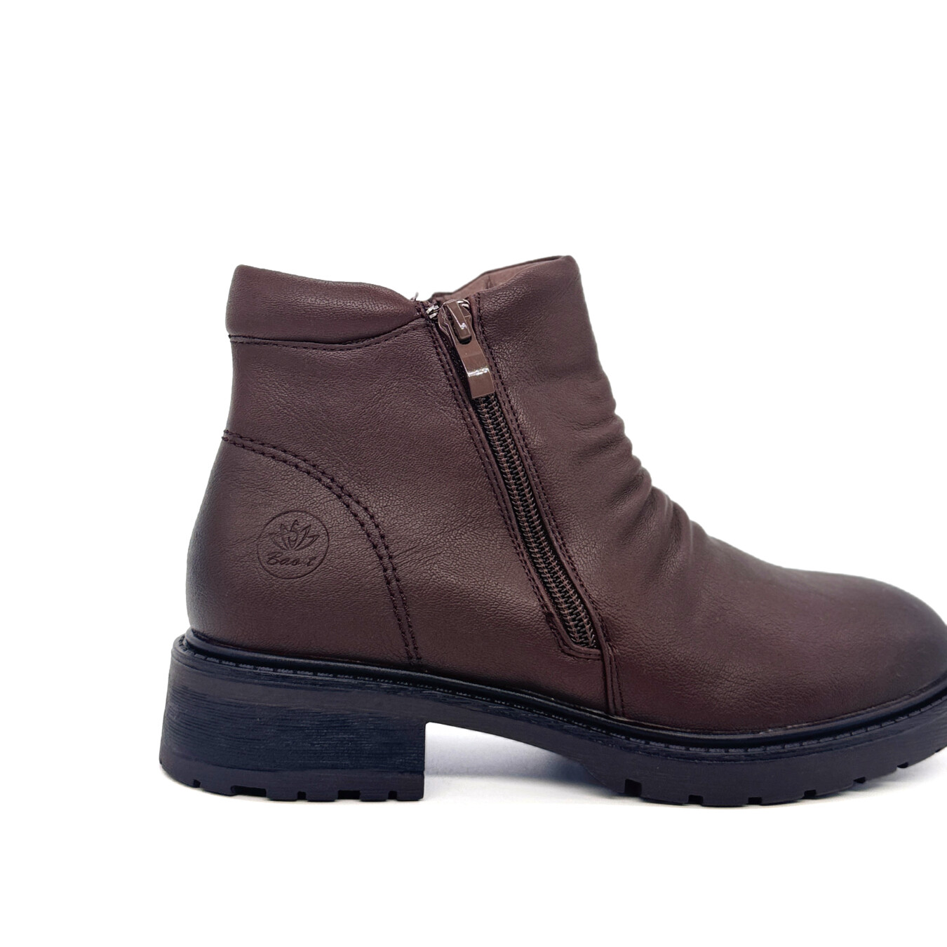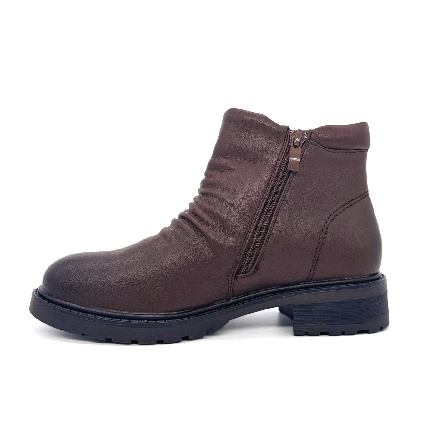 Bota de cano curto em material sintético com acabamento macio e maleável. O design simples e prático apresenta leve efeito franzido na parte frontal, conferindo um toque de estilo ao modelo. Conta com fecho lateral em zíper, que garante facilidade ao calçar e descalçar. A biqueira arredondada proporciona conforto extra no uso diário, enquanto a sola robusta com ranhuras profundas oferece maior aderência e estabilidade. Com salto baixo e resistente, esta bota é ideal para quem procura praticidade, conforto e versatilidade, adaptando-se facilmente a diferentes looks casuais.