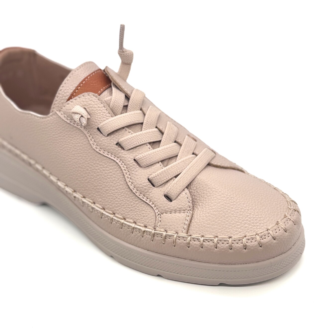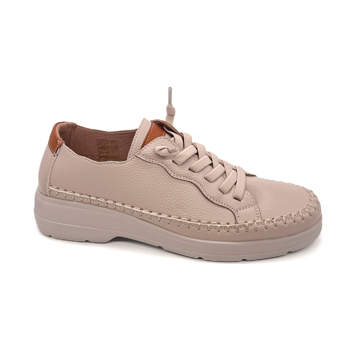 Sapato com cordão de elástico. Apresenta uma ponta amendoada.