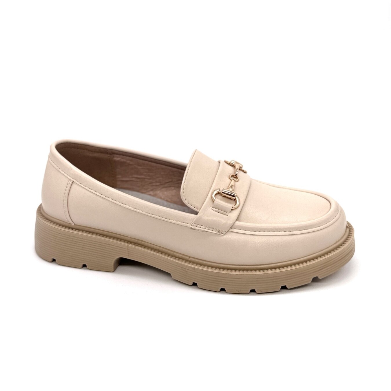 Sapato em pele sintética, com a ponta amendoada e um aplique metálico.