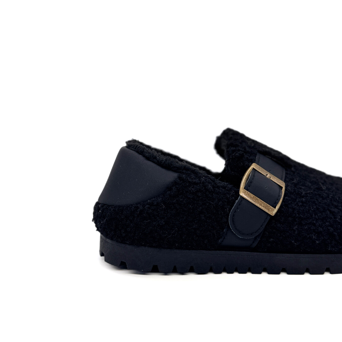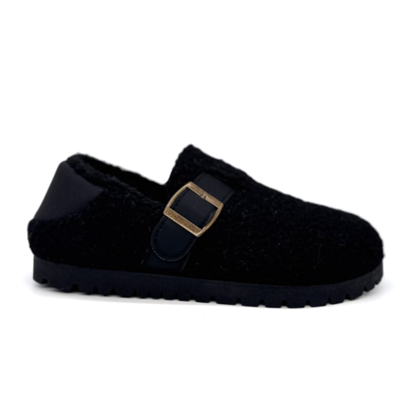 Pantufa rasa com uma fivela. Também pode ser utilizada como socca baixando a calcanheira assinalada com pele sintética.