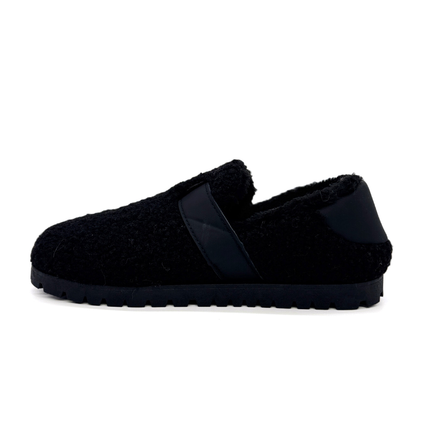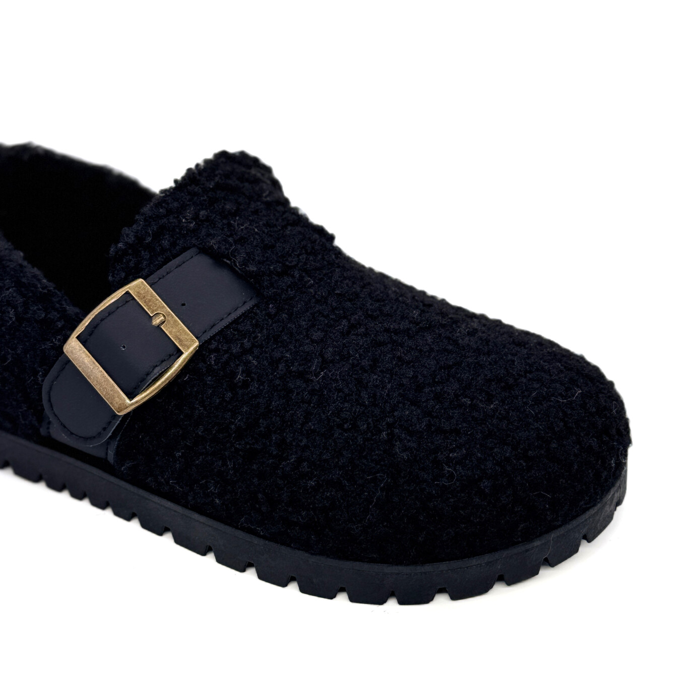 Material externo: Pêlo de ovelha artificial | Material interno: Pêlo artificial | Sola: Borracha
