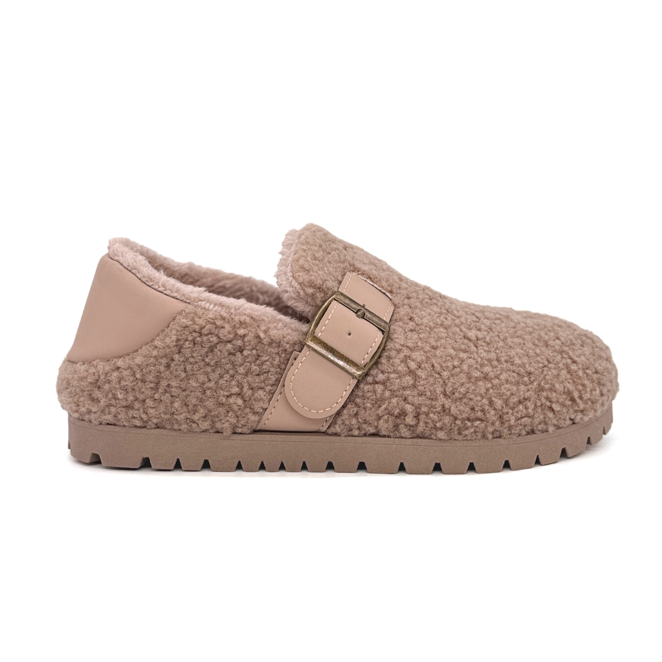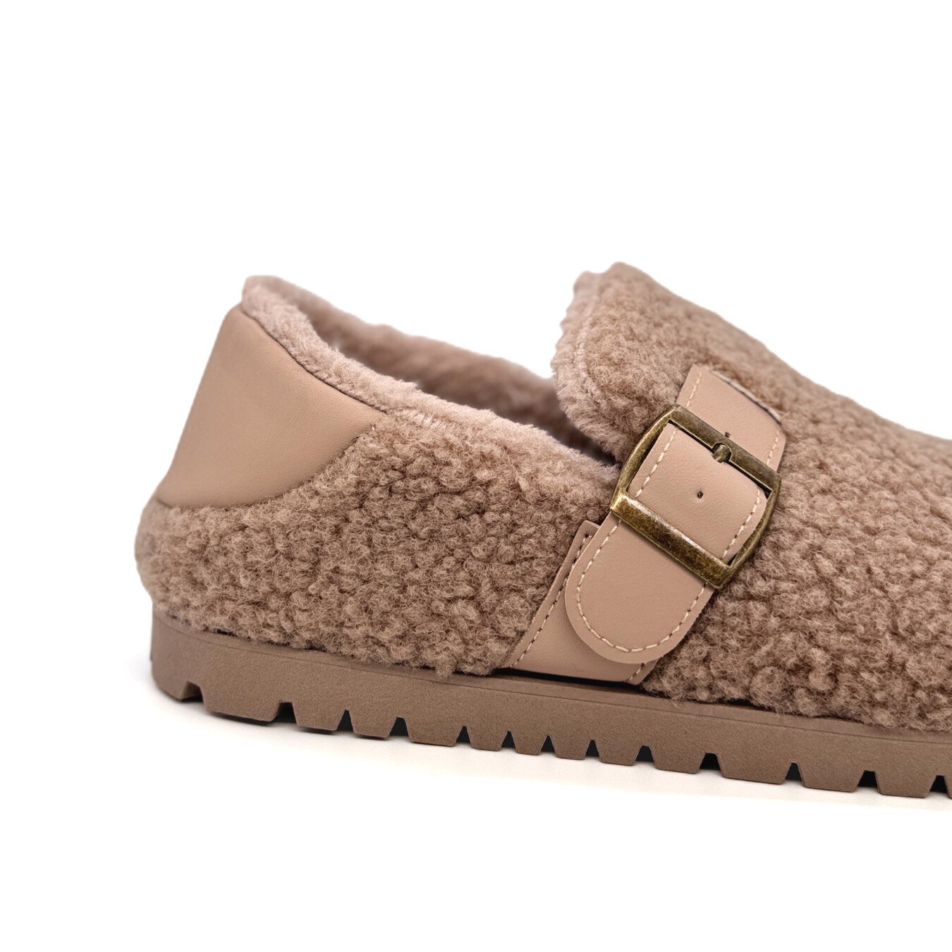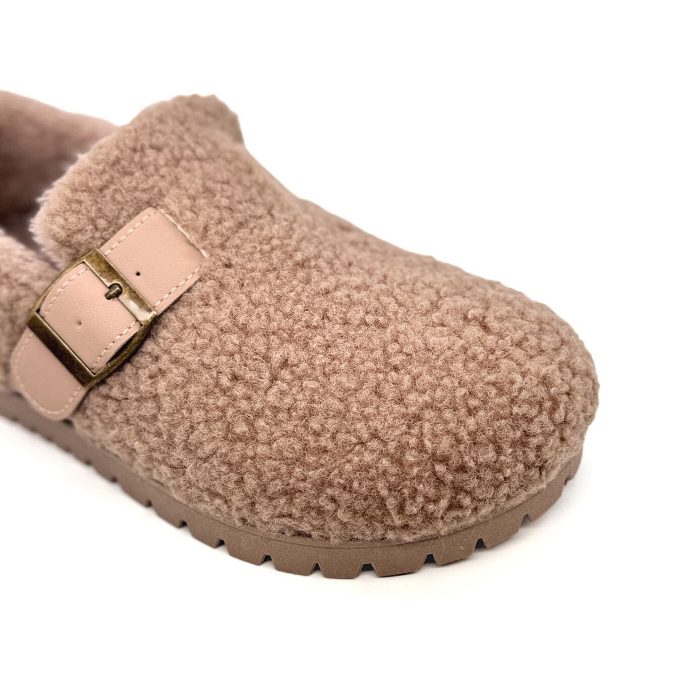 Material externo: Pêlo de ovelha artificial | Material interno: Pêlo artificial | Sola: Borracha